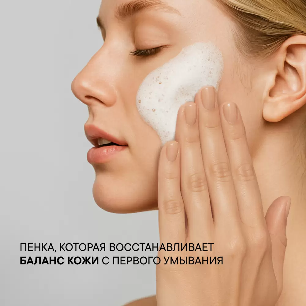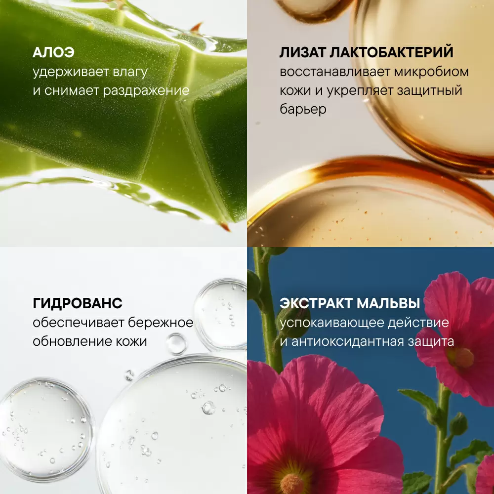 Пенка для умывания — эффективное увлажнение и восстановление микрофлоры уже на этапе очищения. Невесомая гипоаллергенная формула бережно удаляет загрязнения без стягивания. Лизат лактобактерий способствует восстановлению микробиоты и укреплению местного иммунитета кожи. Гель алоэ вера и глицерин увлажняют и успокаивают. Молочная кислота мягко отшелушивает, выравнивая тон. Экстракт мальвы действует как антиоксидант, уменьшая раздражения. Подходит для всех типов кожи, включая чувствительную.
