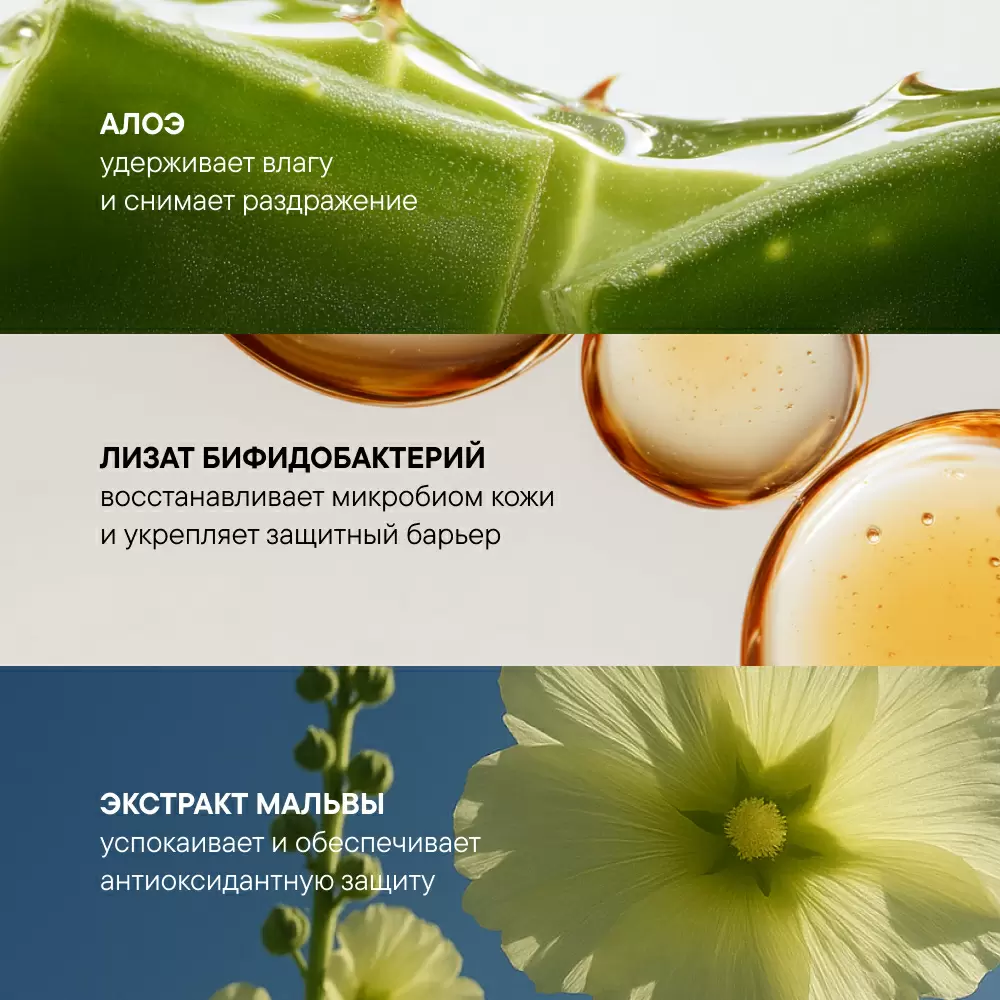 Вода, гидролат алоэ, гидроксиэтилмочевина, глицерин, д-пантенол, лизат бифидобактерий, экстракт мальвы, бензоат натрия, сорбат калия, пентиленгликоль, каприлилгликоль, отдушка, гиалуроновая кислота, молочная кислота, фитинова кислота, гидроксид натрия.