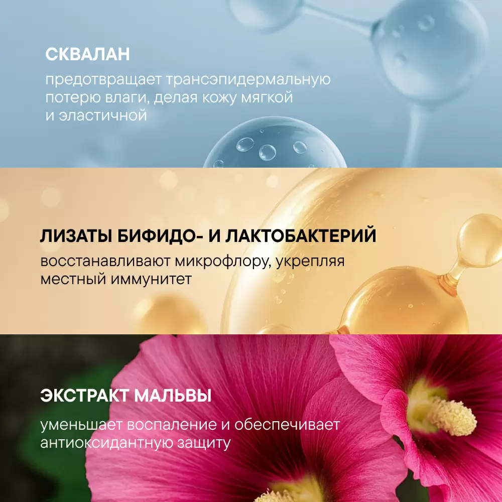 Вода, глицерин, гель алоэ вера, гидроксиэтилмочевина, д-пантенол, протеины пшеницы, натрий PCA, лизат лактобактерий, лизат бифидобактерий, бензоат натрия, сорбат калия, экстракт мальвы, бетаин, ксантановая камедь, сквалан, пентиленгликоль, каприлилгликоль, гиалуроновая кислота, бисаболол, сорбитол, отдушка, молочная кислота, фитиновая кислота, гидроксид натрия.